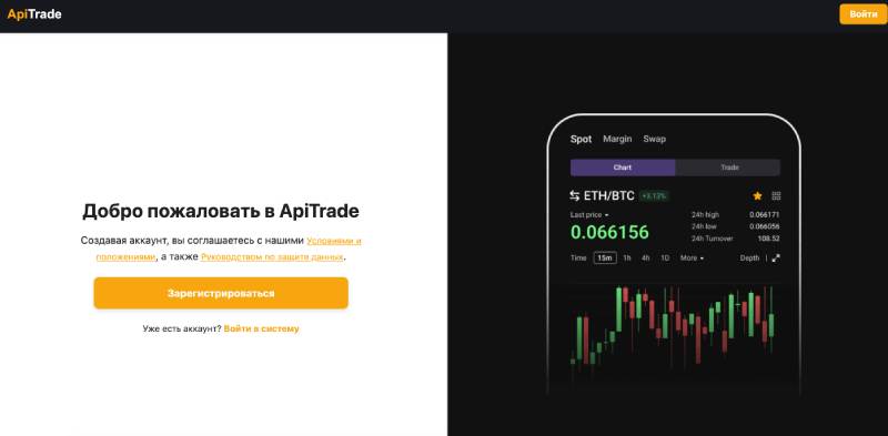 Платформа ApiTrade позиционирует себя как веб-приложение для торговли прямо из браузера, без необходимости установки дополнительного софта. Разработчики утверждают, что их терминал позволяет использовать алгоритмическую торговлю, подключаться к трем криптовалютным биржам напрямую, собирать статистику с разных площадок и работать через API-ключи. При этом выбор инструментов ограничен двумя алгоритмами: «Ураган» для скальпинга и «Сквиз-бот» для автоматической покупки активов во время их просадки. Однако конкретных условий работы — тарифов, комиссий, минимальных депозитов и прочих параметров — компания не раскрывает.